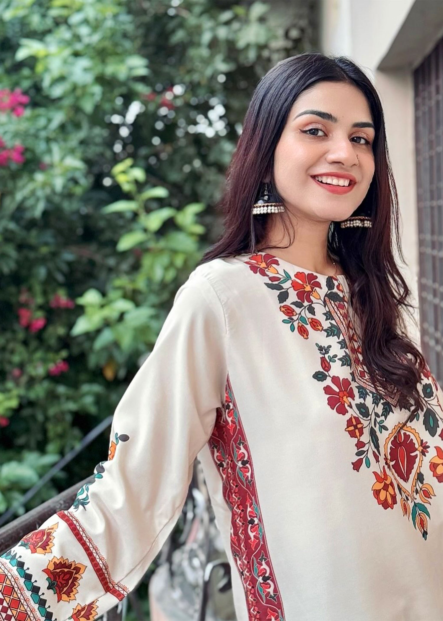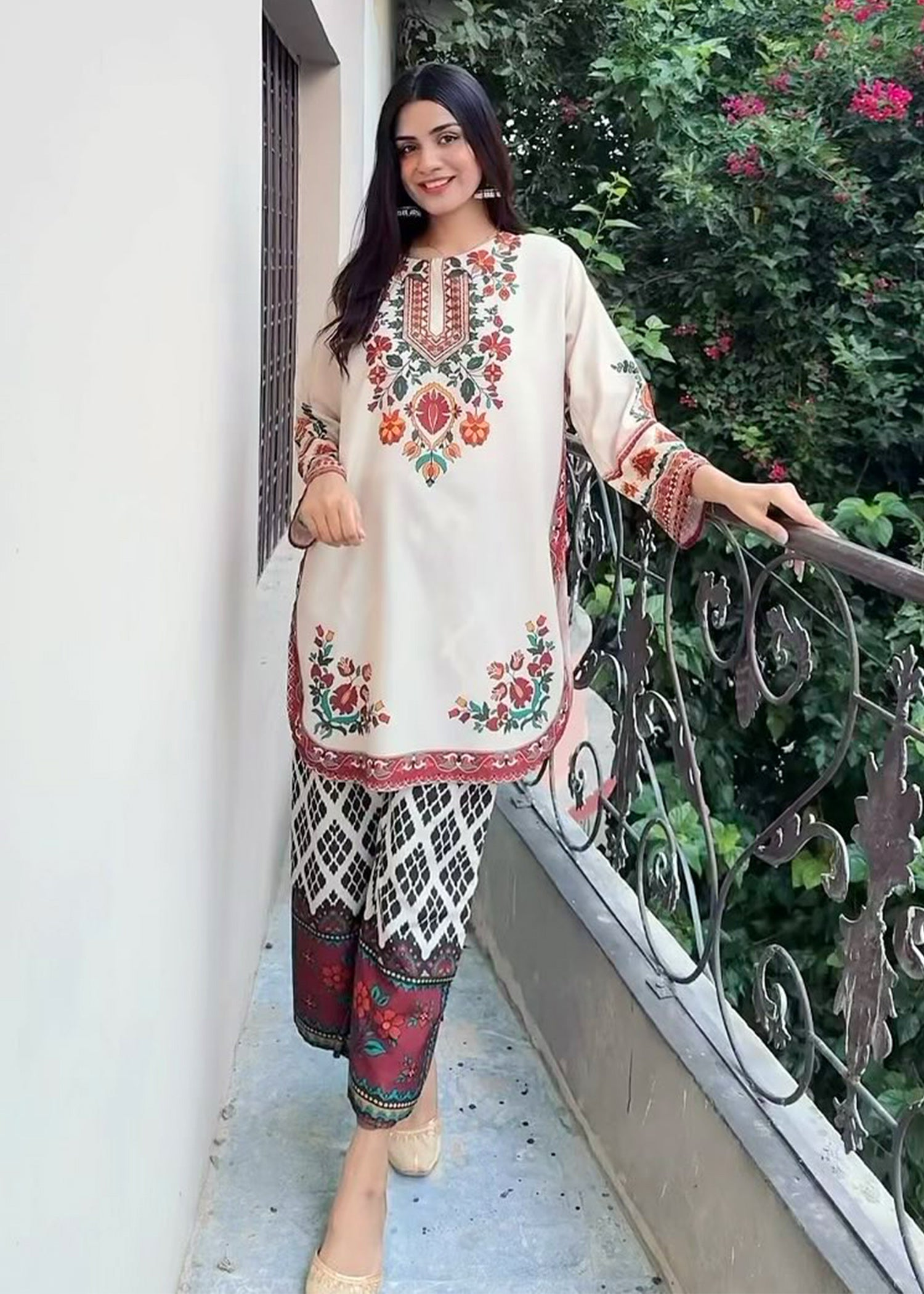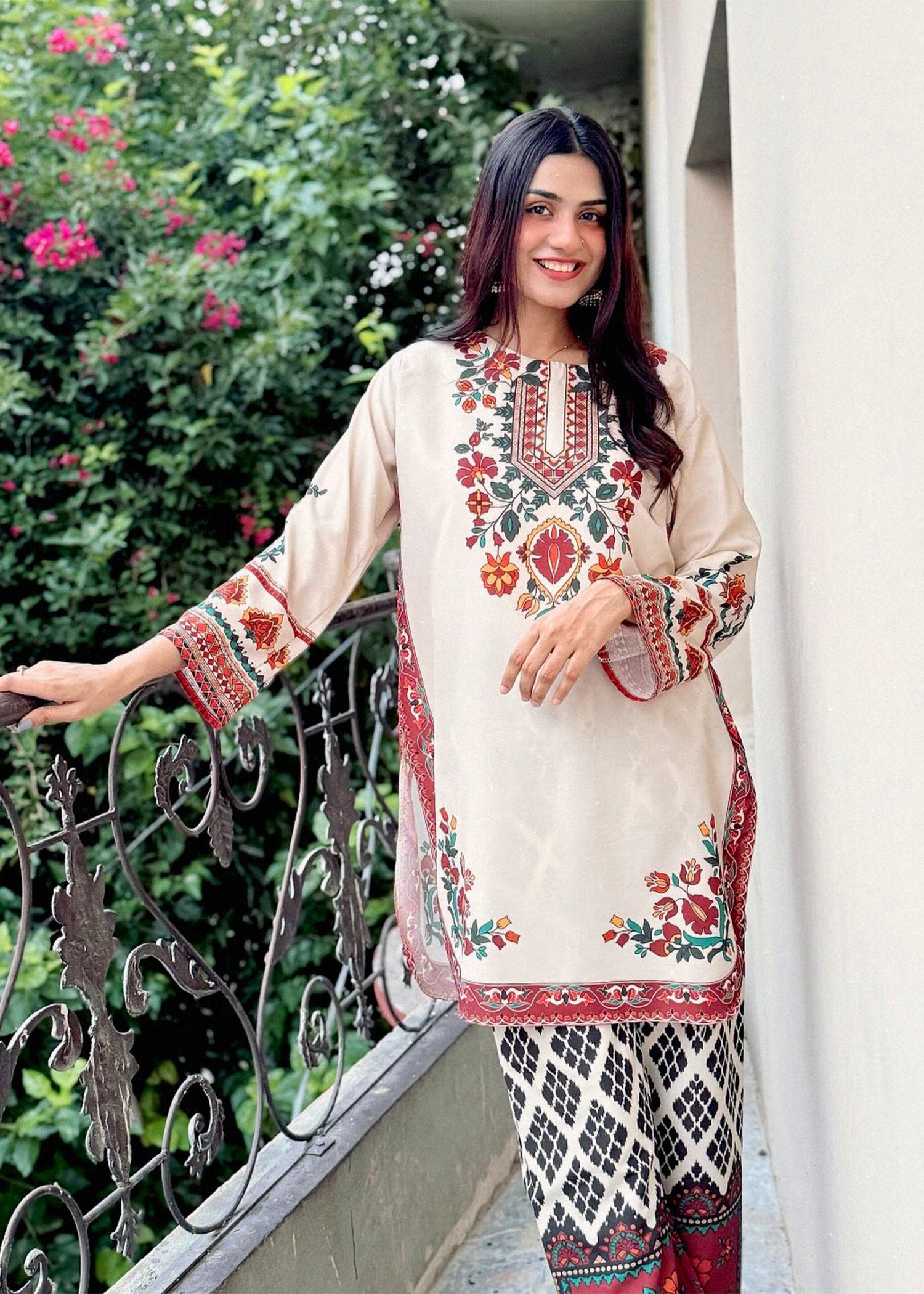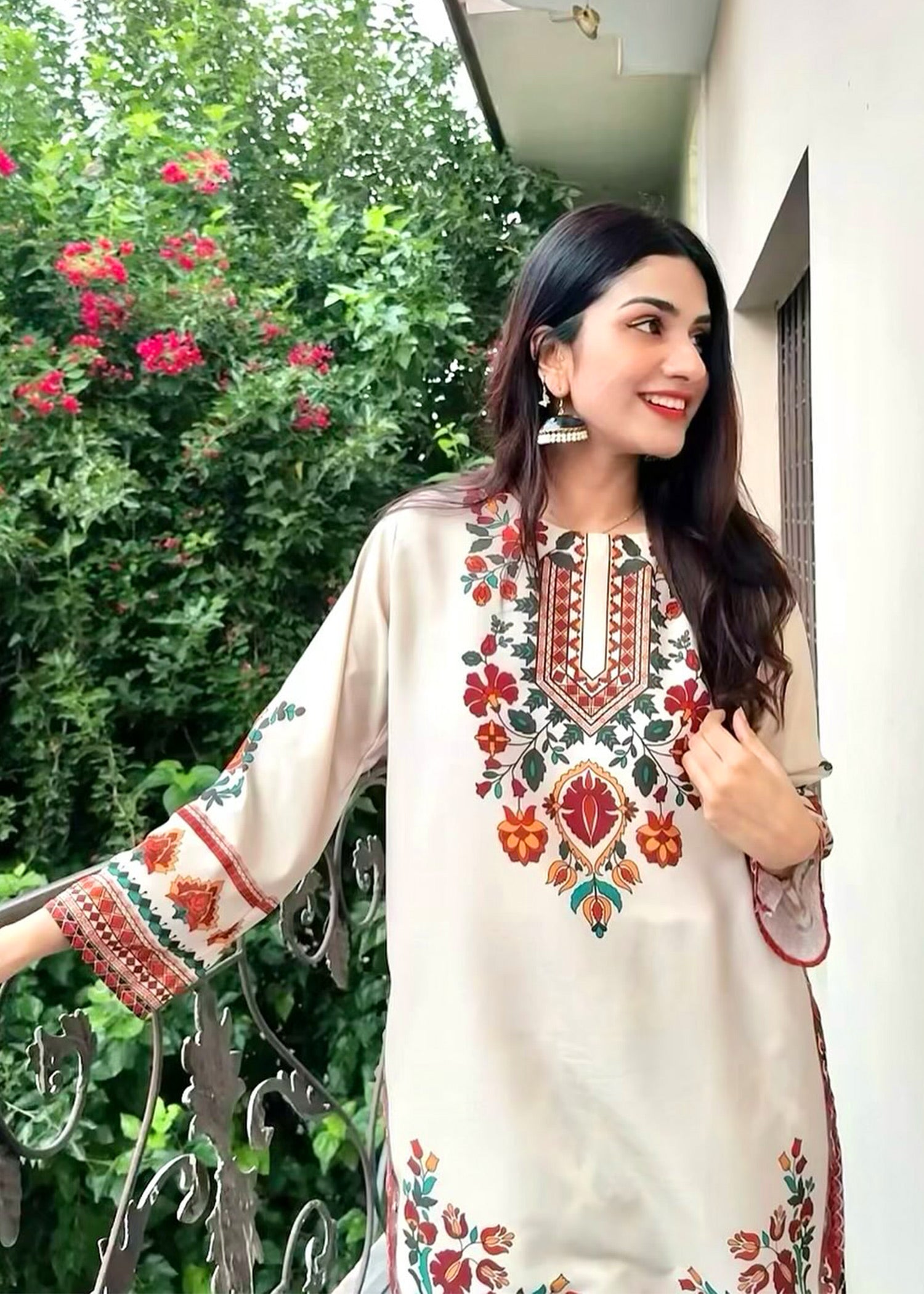 Step into effortless elegance with our Rosé Garden Printed Silky lawn Kurta Set. This two-piece ensemble features a soft cream-hued long kurta adorned with intricate floral and ethnic motifs in warm earthy tones. The neckline and sleeves showcase rich traditional patterns, perfectly complemented by contrasting printed straight trousers with geometric and border accents. Crafted from lightweight fabric