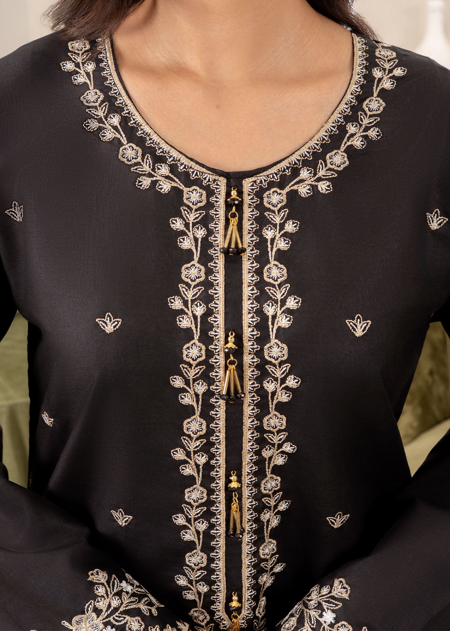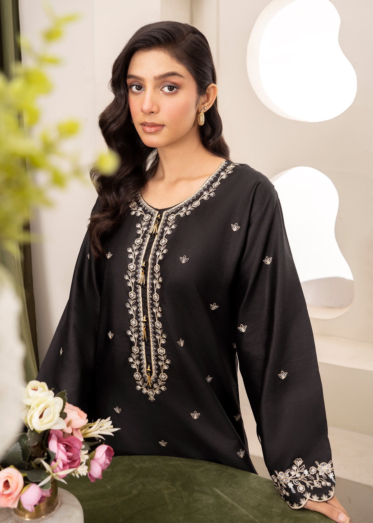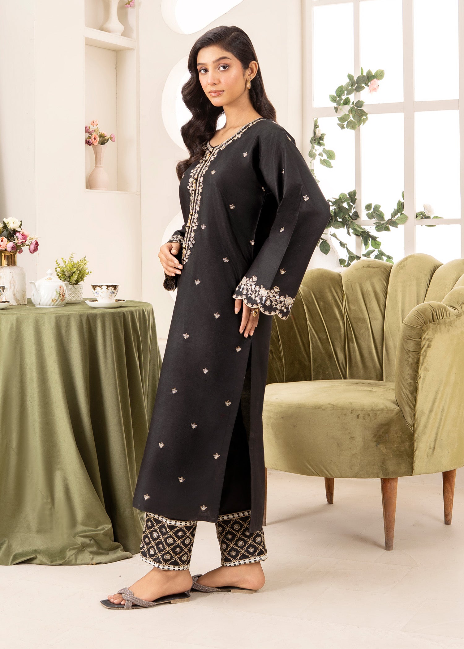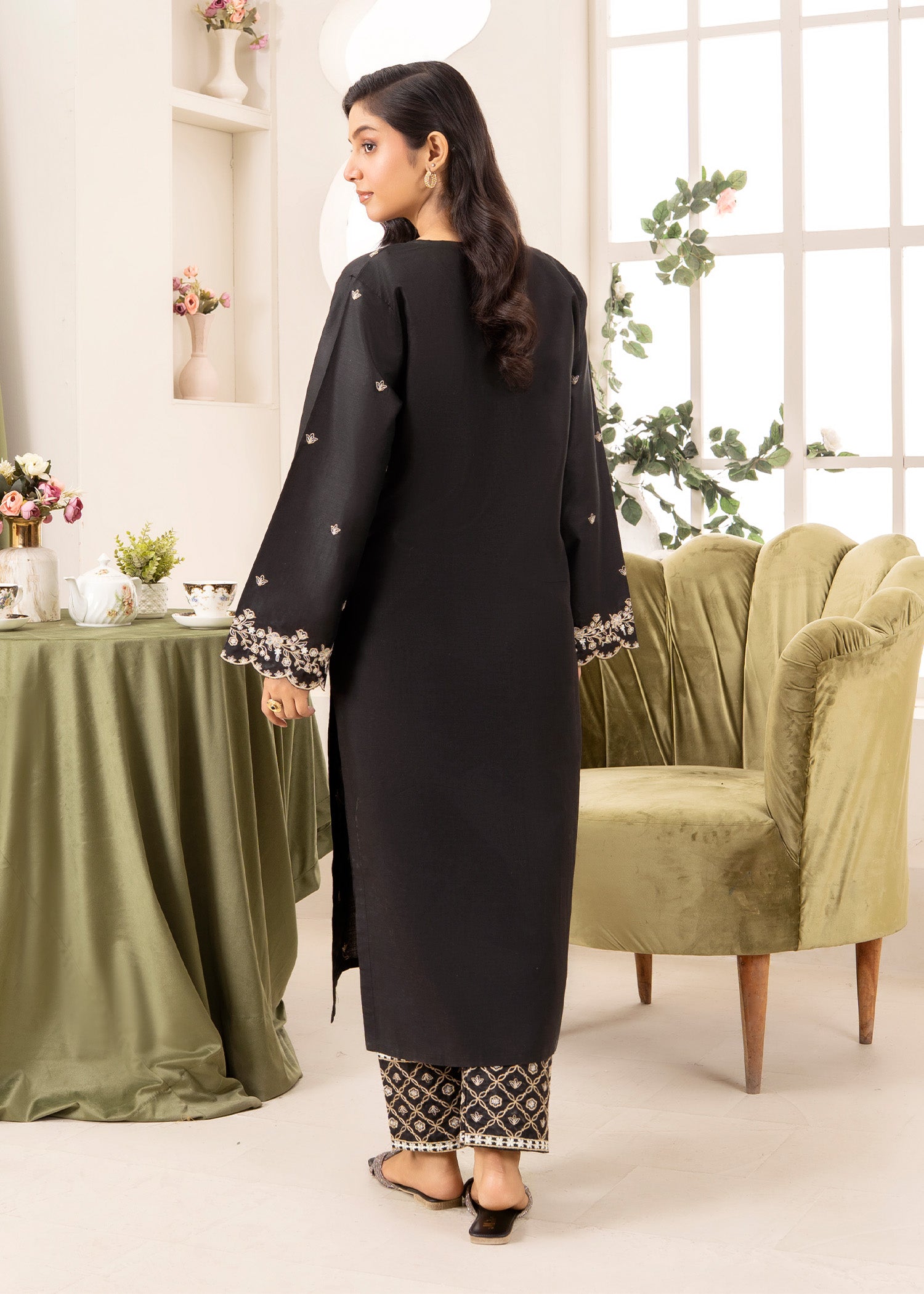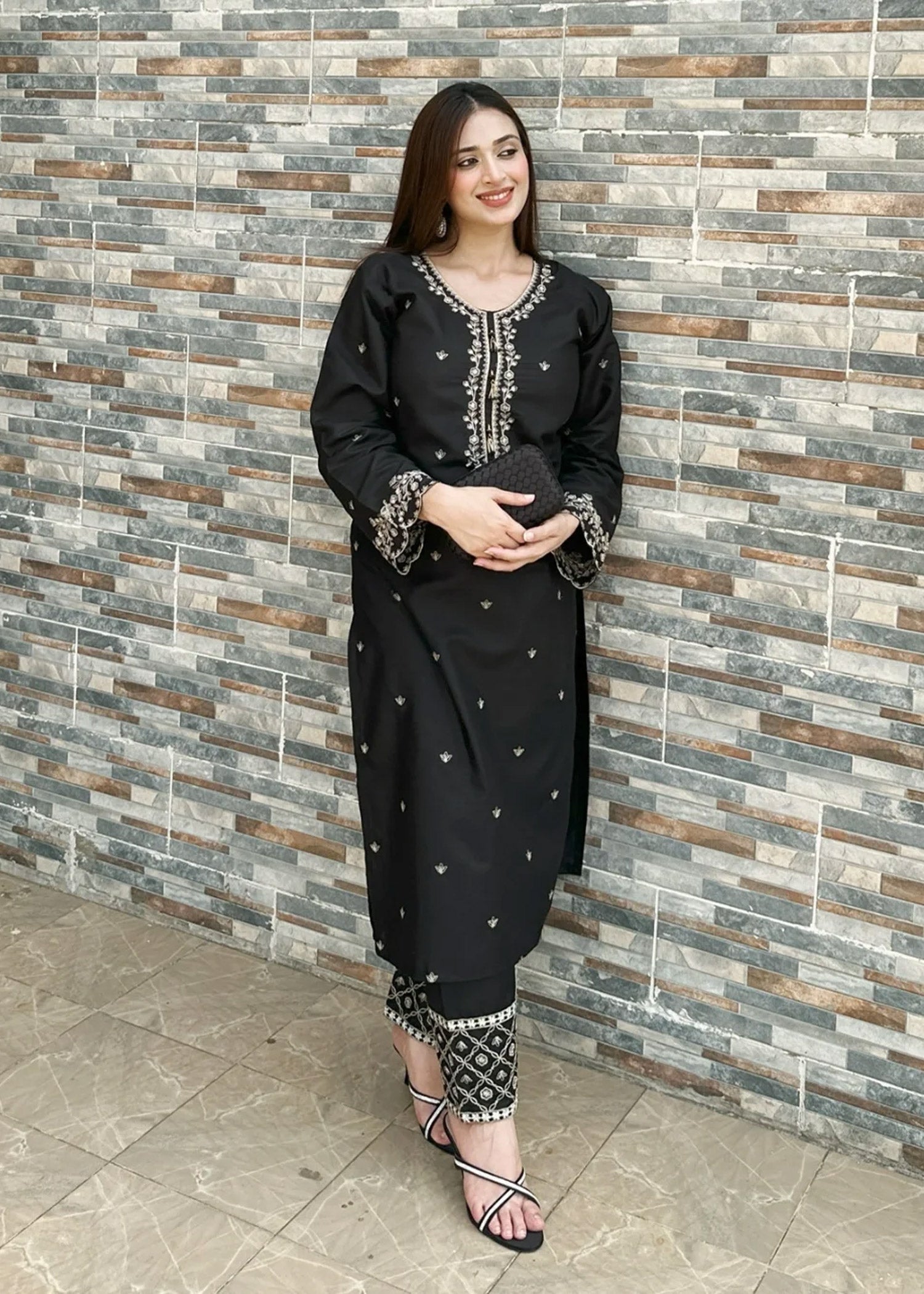 Black Embroidered Cotton Kurta Set – A sleek 2-piece Eastern ready-to-wear outfit for women, featuring a long embroidered kurta paired with straight trousers. Made from breathable cotton, this versatile summer set offers comfort, style, and elegance for daily wear and casual gatherings.