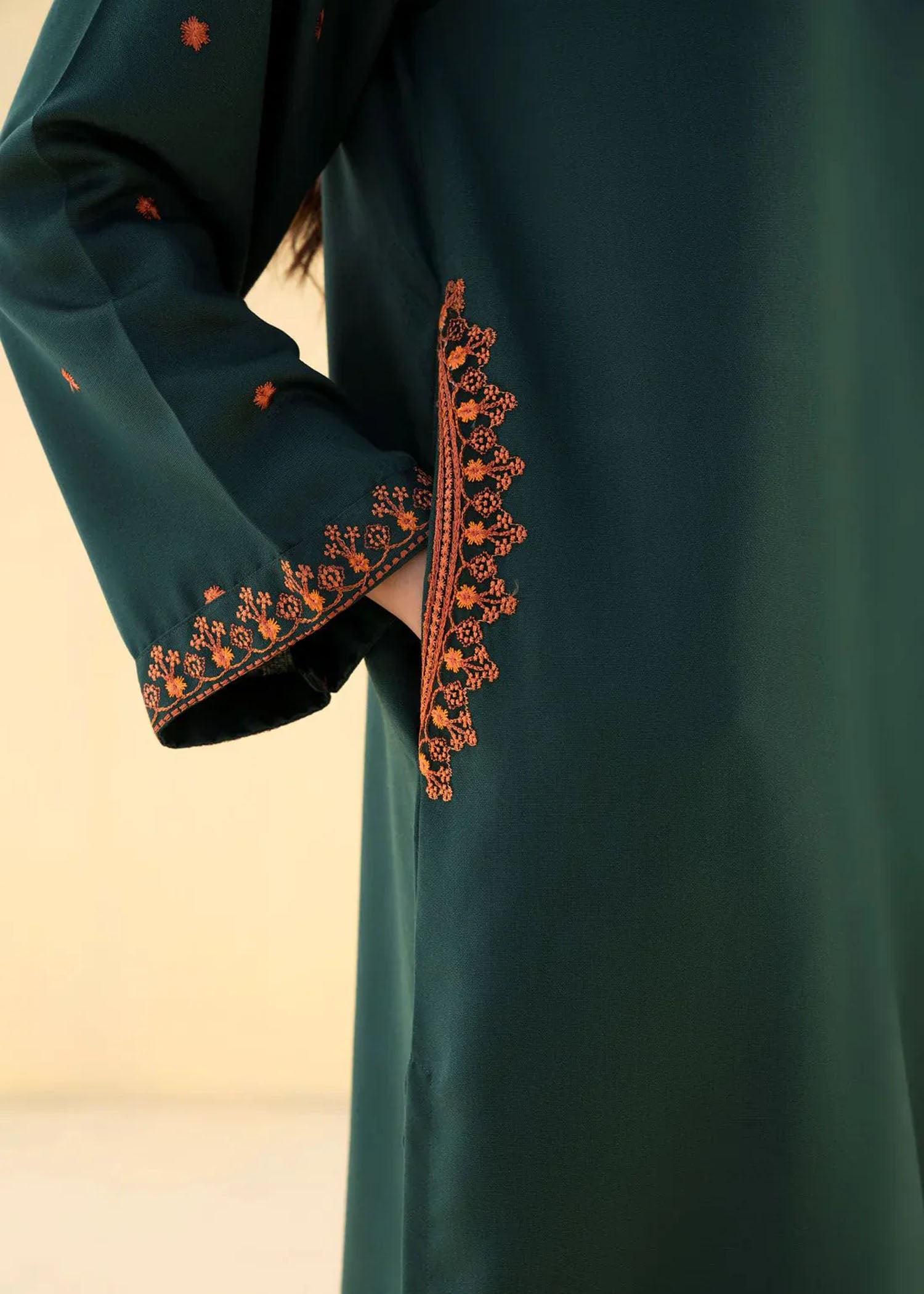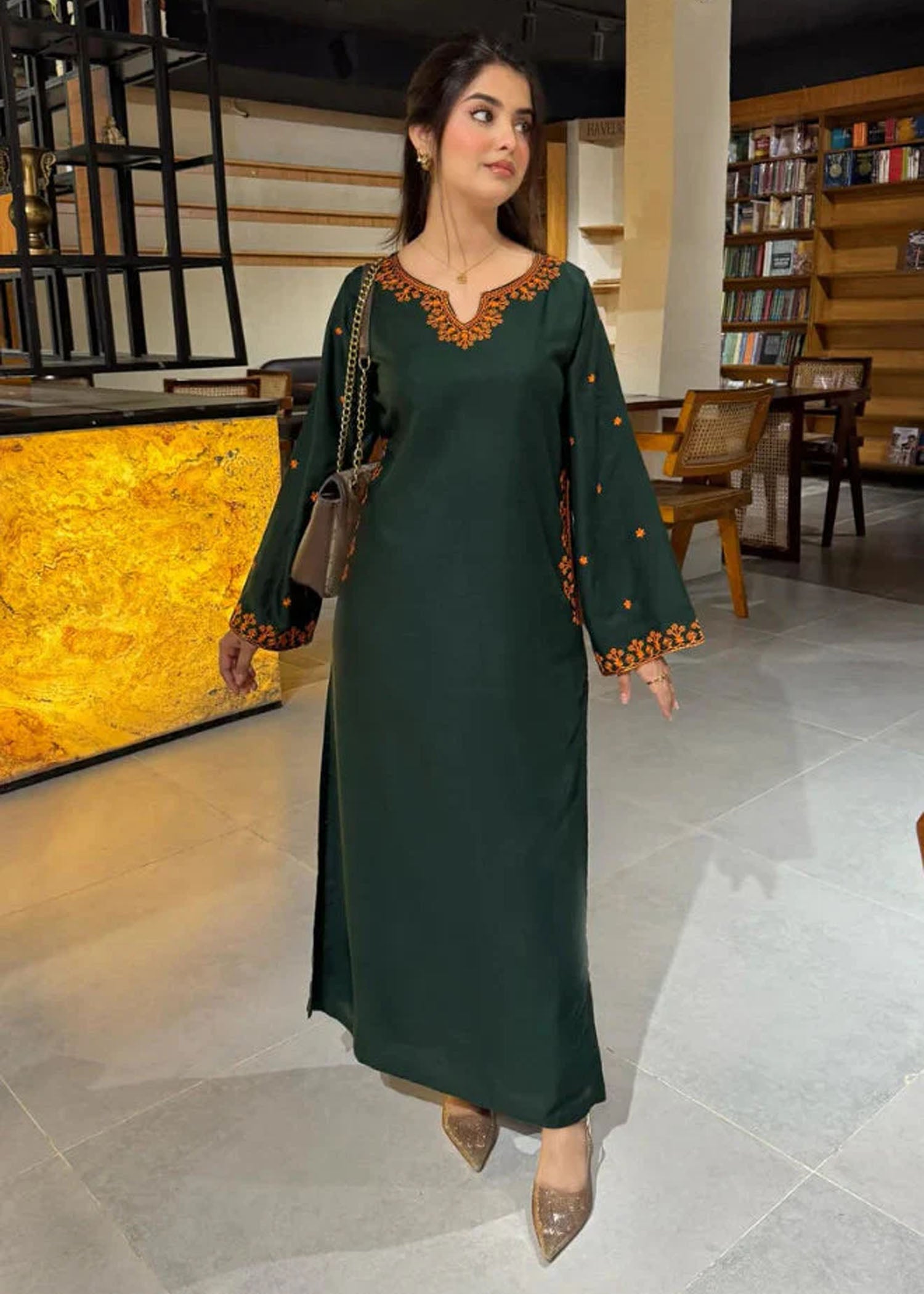 - Embroidery: Hand-embroidered detailing in orange and gold