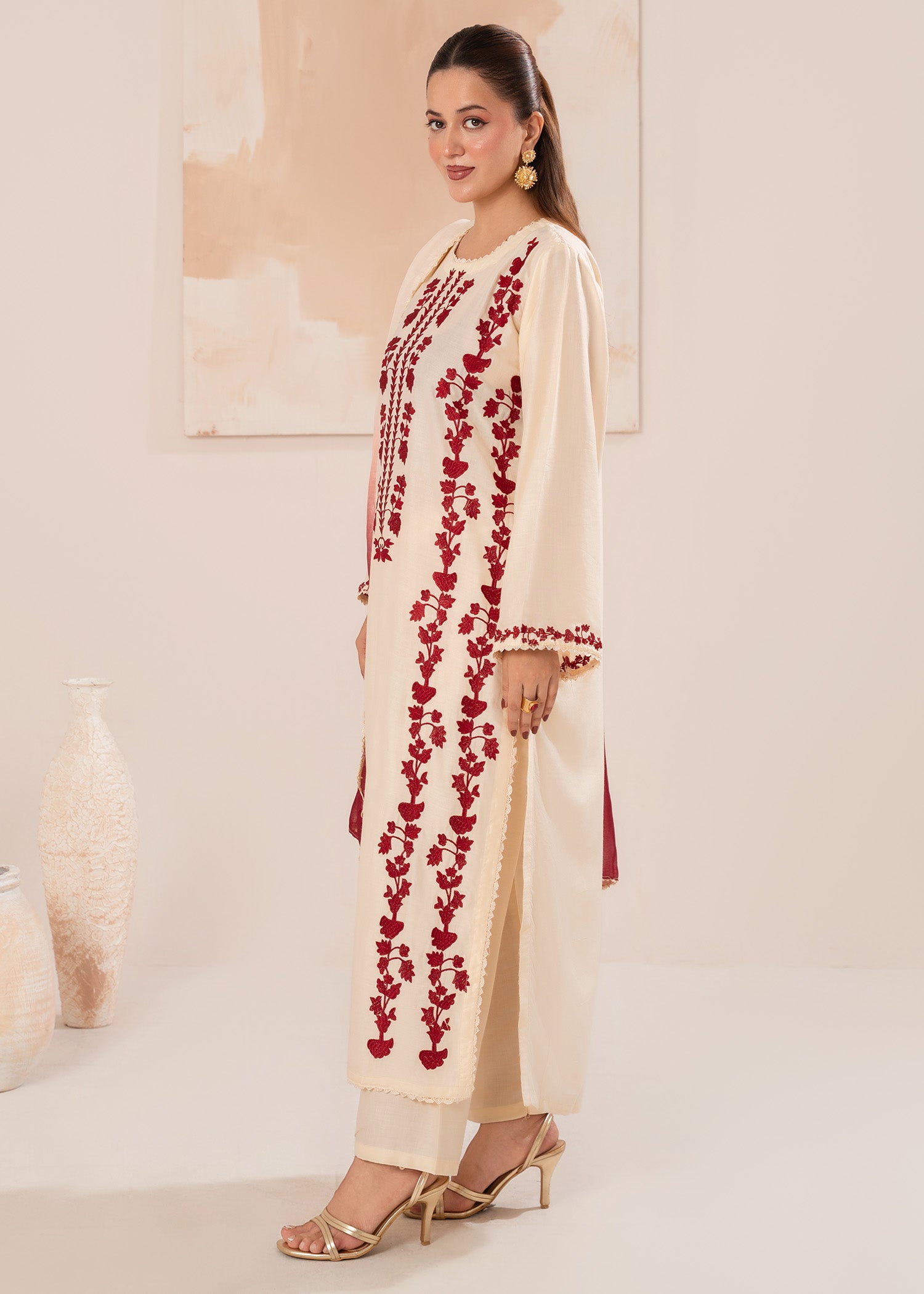 Product Description: Exude effortless elegance in this timeless cream kurta set, delicately adorned with deep crimson floral embroidery. Crafted from soft, breathable fabric, this outfit perfectly blends tradition with modern sophistication. The intricate threadwork along the neckline and panels adds a graceful charm, while the subtle cream base enhances its refined appeal. Paired with straight trousers and a shaded crimson dupatta, Crimson Ivy is ideal for festive gatherings, semi-formal occasions, or evening wear.