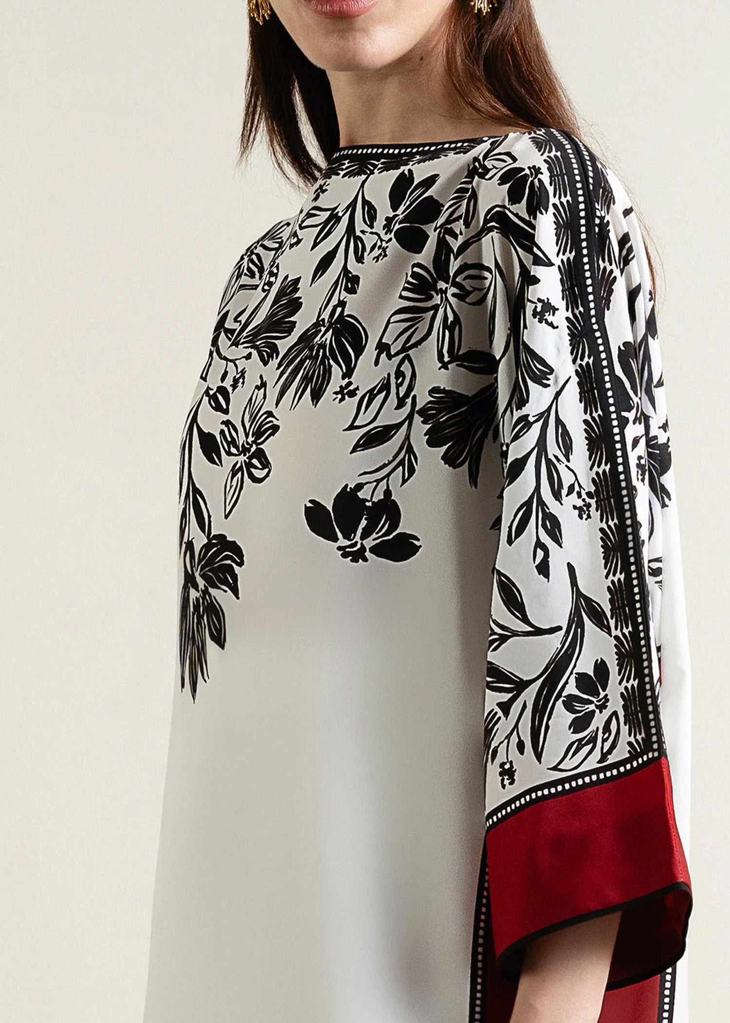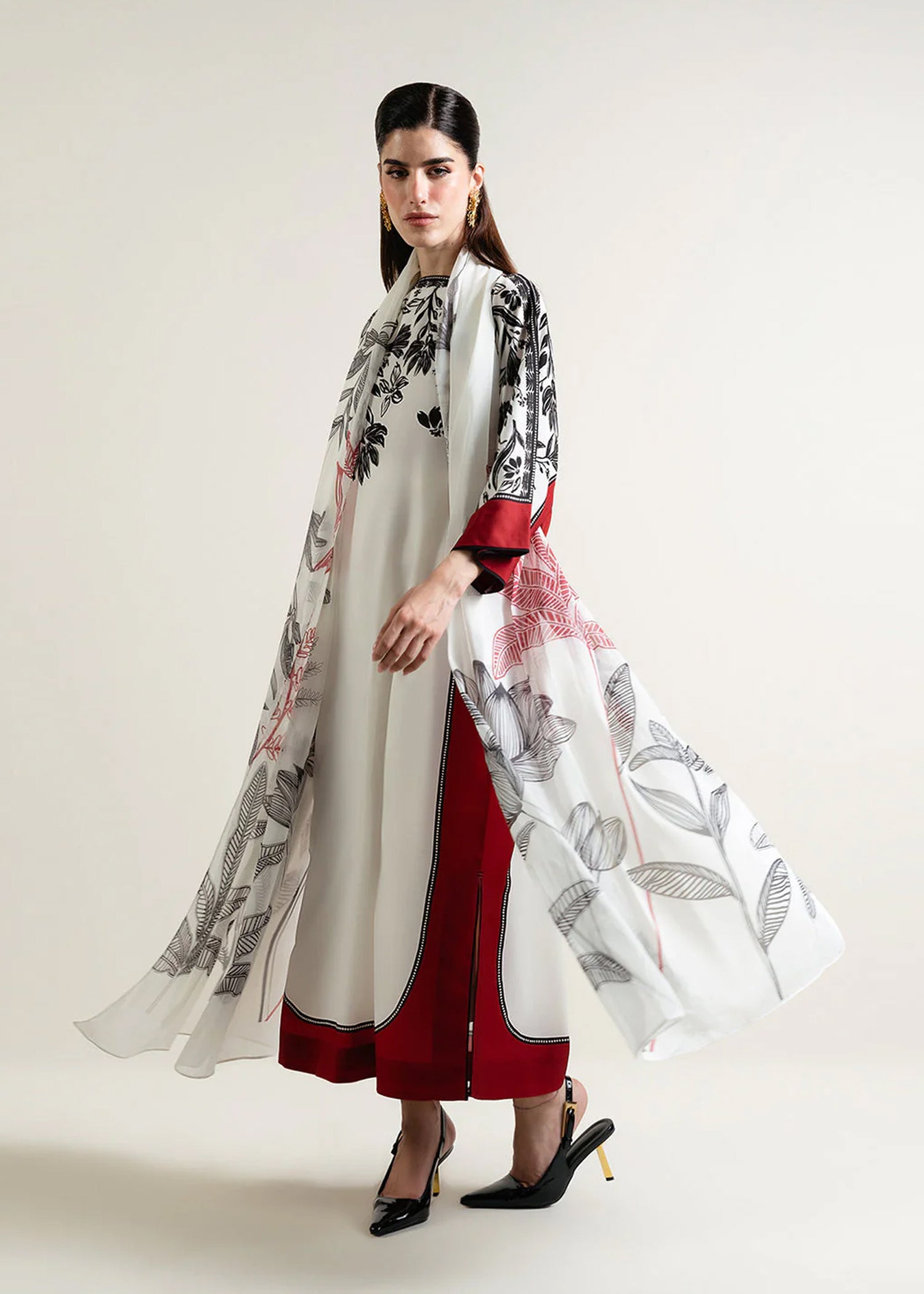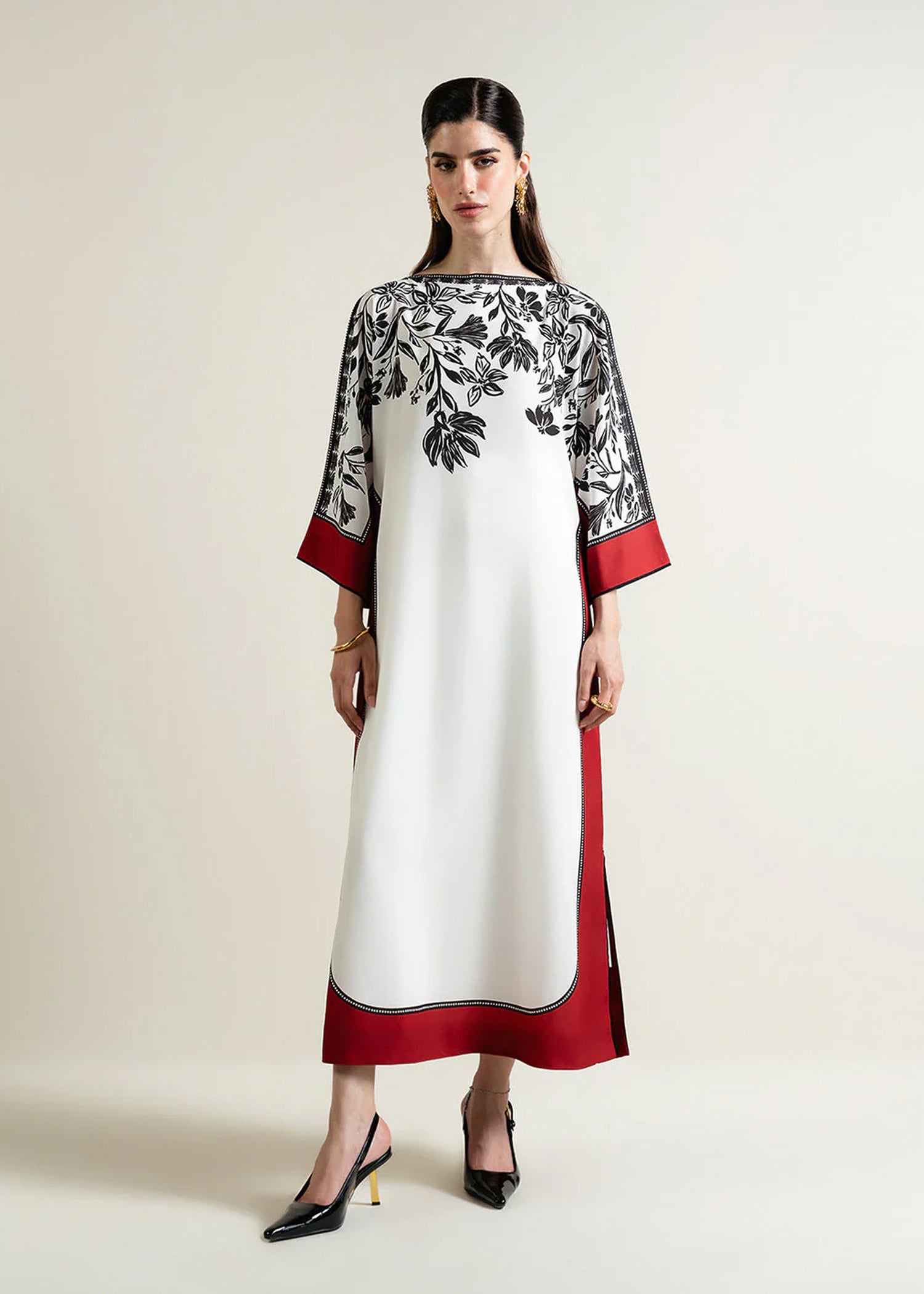 Step into refined sophistication with the White Noir Elegance — a graceful white long kaftan designed to make a statement. The crisp white base is beautifully contrasted with intricate black floral motifs adorning the upper bodice and sleeves, while rich maroon borders at the sleeves and hem add a striking finish. With its flowing silhouette and minimal design, this piece is perfect for formal dinners, festive occasions, or elegant evening gatherings.